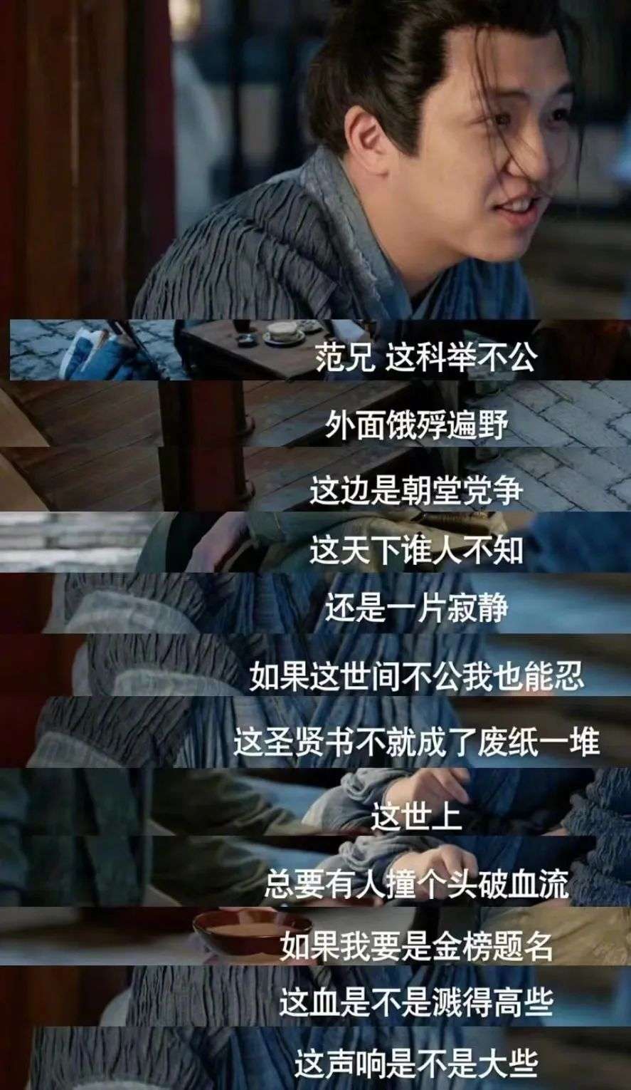 究其原因,剧中或浮光掠影或掷地有声地陈述的众生百态,与当下的社会现状有着极强的关联。老金父女在权贵争斗面前命如草芥,邓子越因为缺少靠山而在黑暗的职场中被磨平了棱角,遭逢天灾的流民无处可去,以自己死谋家人生。范闲在春闱考场前说溜嘴的高考誓词,唤起了无数人高考的记忆,而他辗转反侧的那句“不公平啊”,也代表了无数寒窗苦读学子的心声。