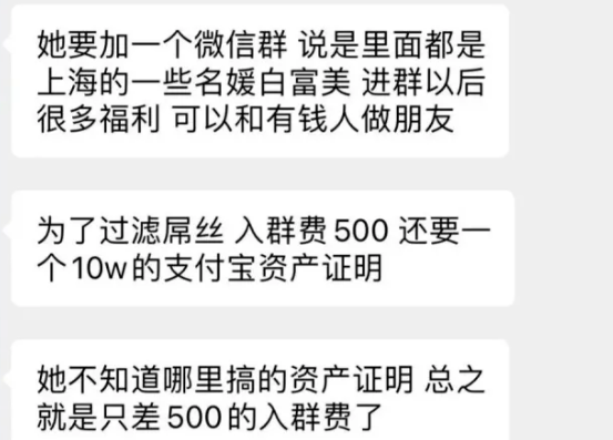 他女友要加一个微信群,说里面都是上海的一些白富美名媛,进群以后有很多福利,可以和有钱人做朋友。