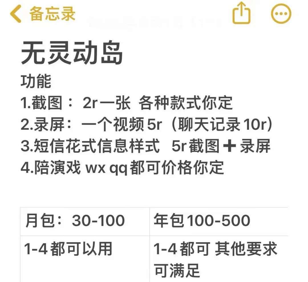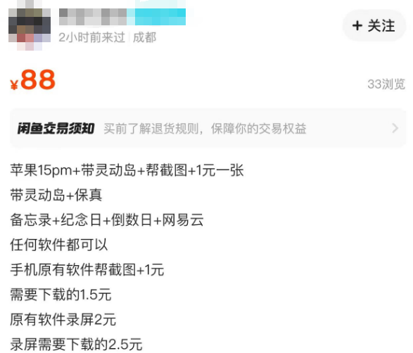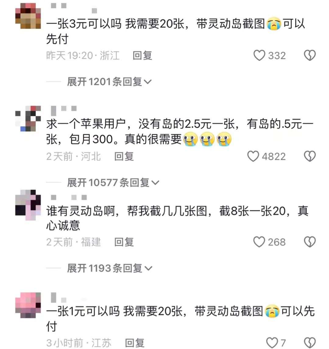 一博主发帖:“苹果手机帮截图,5块钱一张;带上灵动岛,10块钱一张。量大,还能包月。”