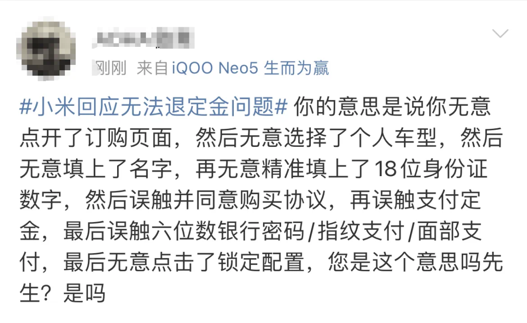 “这位先生,您的意思是说您无意点开了订购页面,然后无意选择了个人车型,然后无意填上了名字,再无意中精准填上了18位身份证数字。然后误触并同意购买协议,再误触支付定金,最后误触六位数银行密码/指纹支付/面部支付,然后点击锁定配置,再确认锁定,您是这个意思吗先生?”