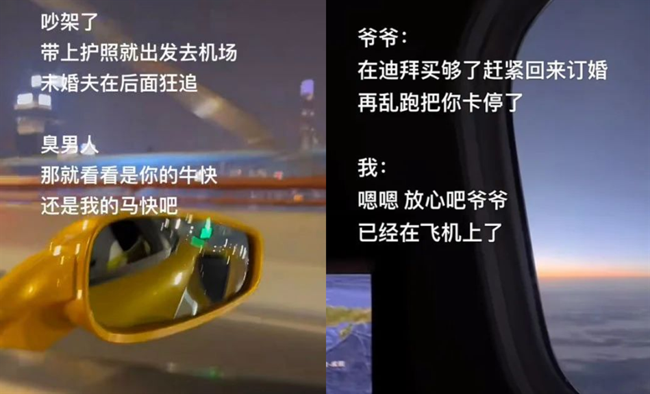 “吵架了,带上护照就出发去机场,未婚夫在后面狂追,看看是你的牛快还是我的马快。”