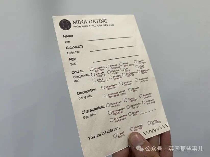 男顾客会事先填一张表,包括姓名、国籍、工作、星座、性格等等,女顾客可以参考这份表,决定要不要跟对方相亲。