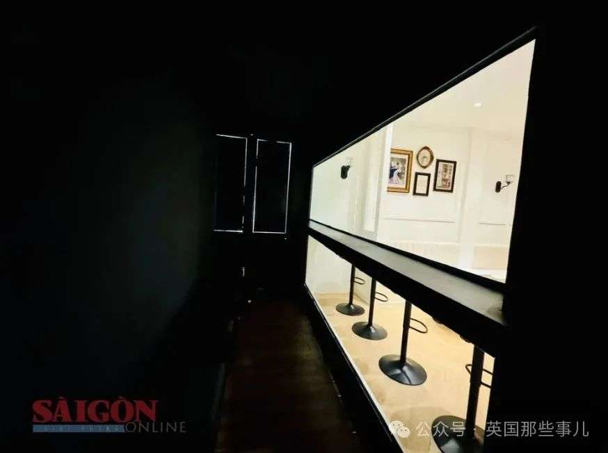 玻璃的那一边有一个黑色主题的房间,像一个电影放映厅,有两排座位,坐在那里可以观察咖啡馆里人们的一举一动。