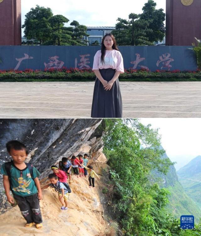 2012年,广西11岁的蒙秋艳,每天上学都要经过一段200多米长、100多米深的半山悬崖,冒着危险翻越大山才能抵达学校。