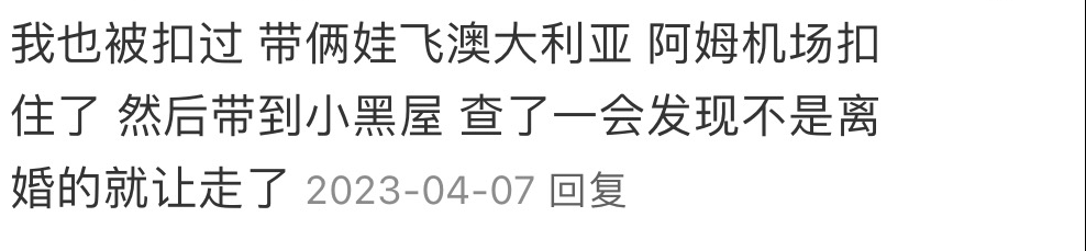 原来这位网友此行只有她自己带孩子,老公因为工作并没有同行,海关表示因为没有“缺席一方”父母的离境同意书,因此不能允许这位妈妈带孩子离开美国。
