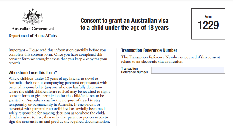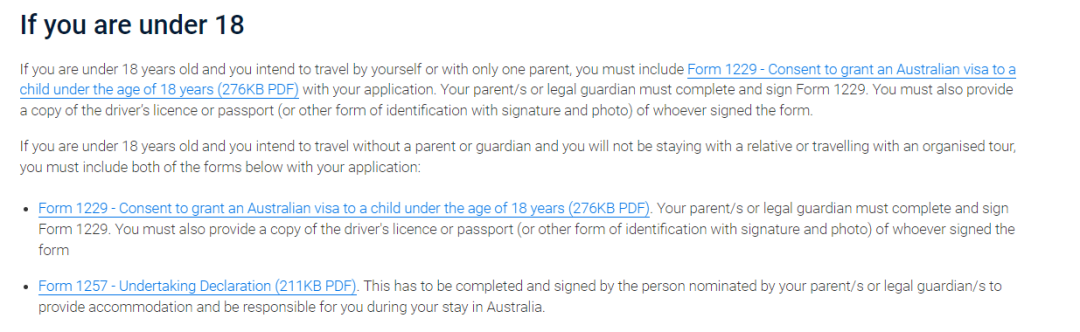 如果申请人未满18岁,并且打算独自旅行或只有一位父母同行,必须在申请中附上表格1229 -同意授予18岁以下儿童澳大利亚签证(Form 1229 - Consent to grant an Australian visa to a child under the age of 18 years)。