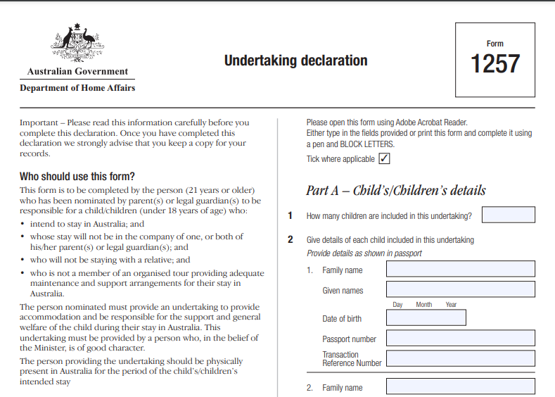 表格1257 -承诺书(Form 1257 - Undertaking Declaration)。这必须的父母或法定监护人指定的人填写并签署,这个人将提供住宿,并在申请人澳大利亚逗留期间对其负责。