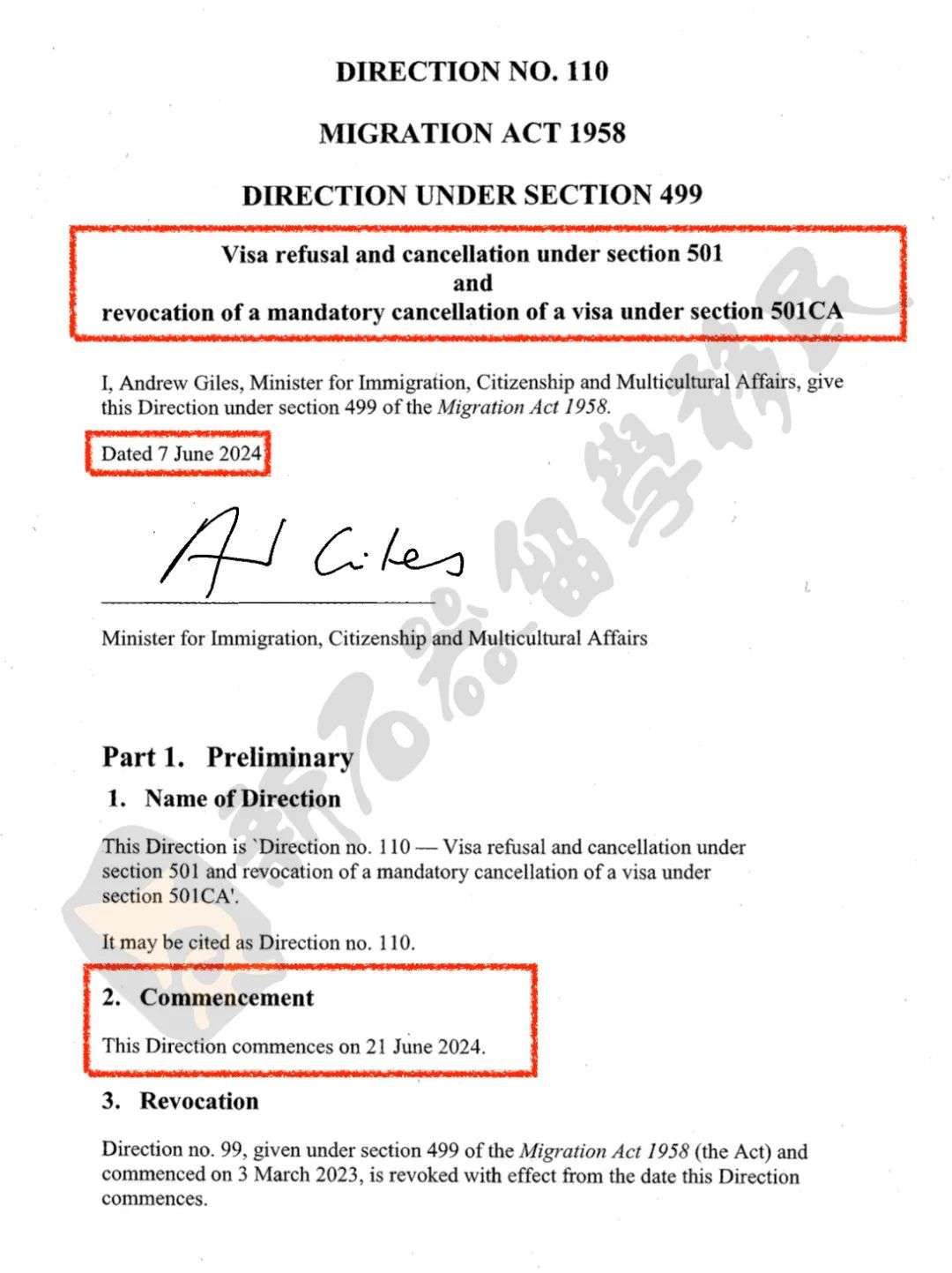 在7日,移民部长签署了第110号部长指令(D110)。在D110下,部长代表、AAT或未来成立的ART将根据法案第501或501CA条款(与品格测试相关)作出拒签、取消签证以及恢复签证的决定。