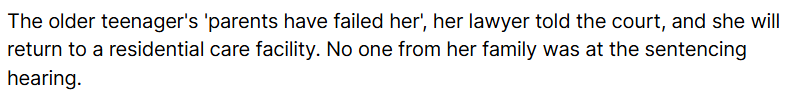然而,女孩的辩护律师Simon Lewis表示,被告长期缺乏来自父母的关爱和教育,这才误入歧途。庭审结束后,她将被送往一家住宿护理机构。
