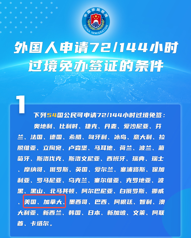 也就是说,来自54个国家(包括加拿大)的公民,凭有效国际旅行证件和限定时间内确定日期及座位的联程客票过境上述城市前往第三国(地区),可免办签证在规定区域内停留。