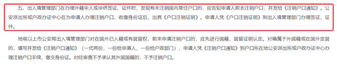 后查询得知,根据相关法律法规:“出入境管理部门在办理外籍华人或华侨签证、证件时,发现有未注销国内常住户口的,应告知申请人前去注销户口,并发给《注销户口通知》。公安派出所或户政办证中心在为申请人办理注销户口、收缴身份证后,出具《户口注销证明》。申请人凭《户口注销证明》到出入境管理部门办理签证、证件。”