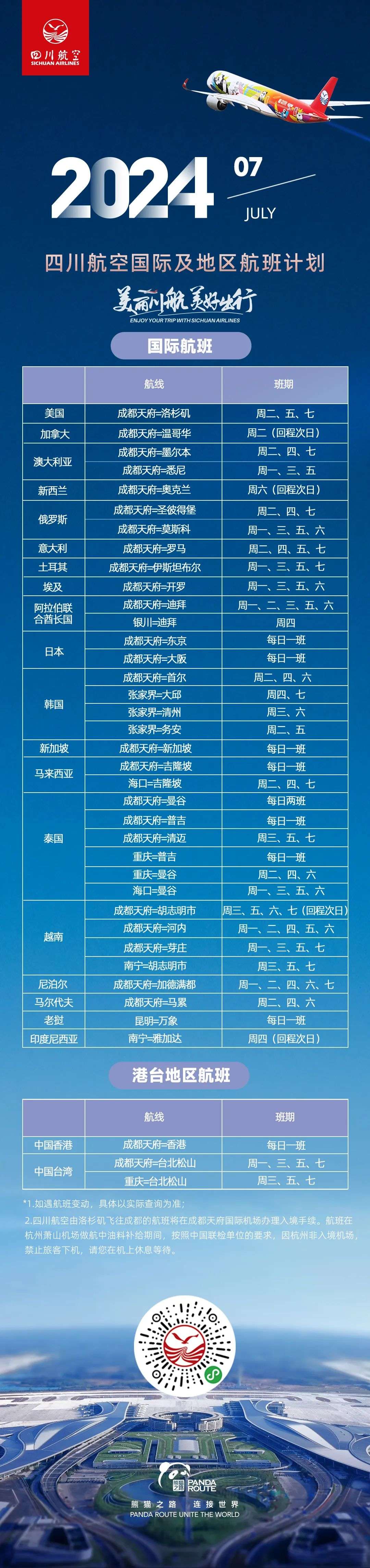 四川航空发布2024年7月国际及地区航班计划,35条国际航线,3条港台地区航线,请查收具体航班计划!