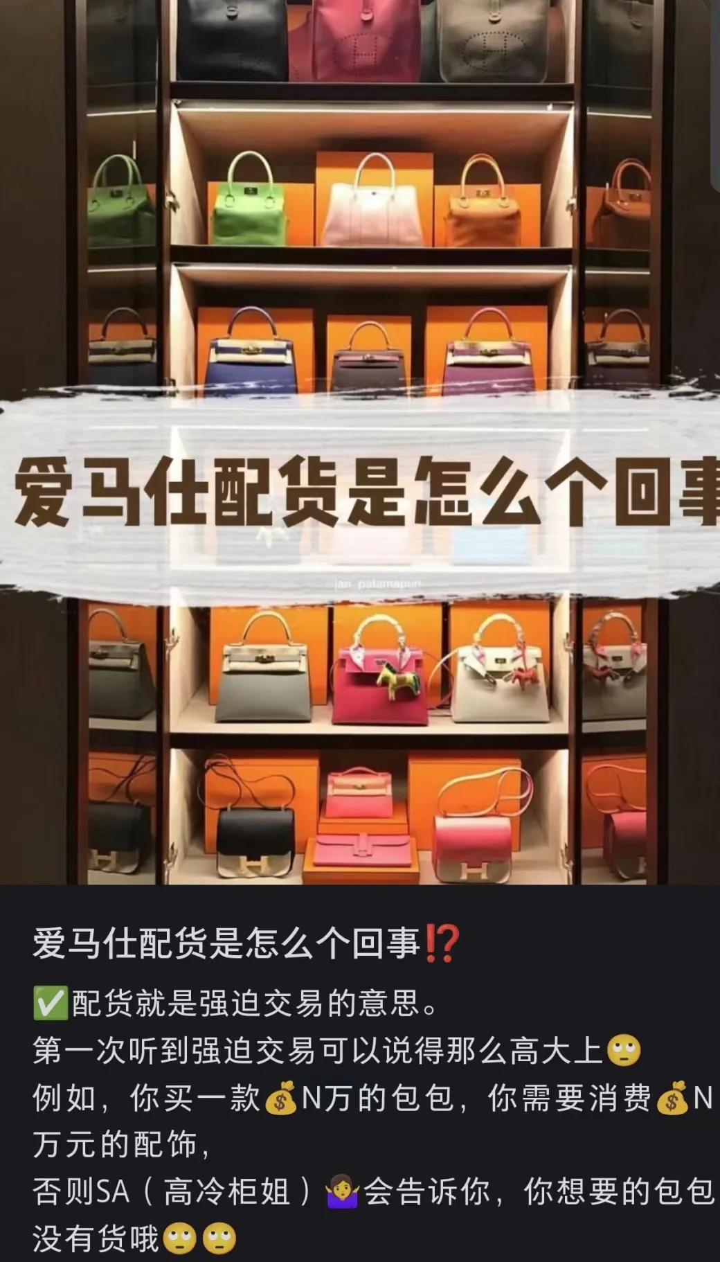 众所周知,买爱马仕包要“配货”。也就是说,当有人想买某个爱马仕包包时,不仅要付款买包,还要另外购买一定比例的其他商品,才能把心仪的包包买走。