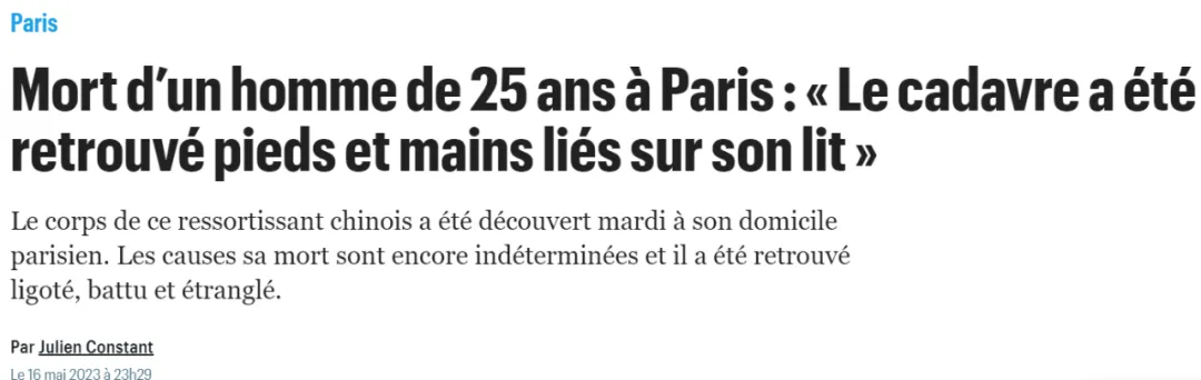 Le Parisien:25岁中国男子在巴黎家中死亡,“尸体被发现时手脚被绑在床上”