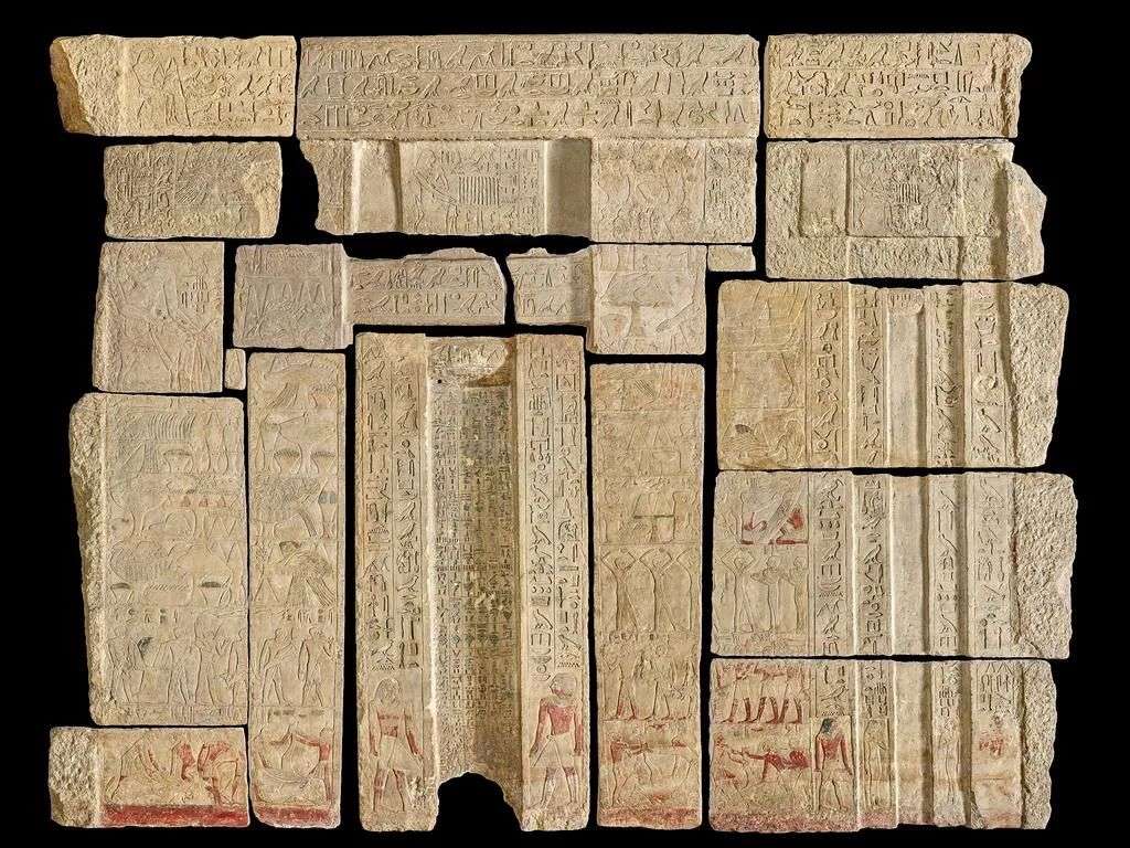 比如,一面来自4000年前的马斯塔巴墓的石灰岩墙(约公元前 2985 年),上面雕刻着精美的象形文字和图案,展示了古埃及“死者在来世所需的一切”。