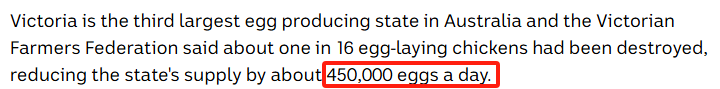 作为澳大利亚第三大产蛋州,维州农民联合会估算,大约每16只产蛋鸡中就有1只被销毁,导致每天的鸡蛋供应量减少约45万颗。