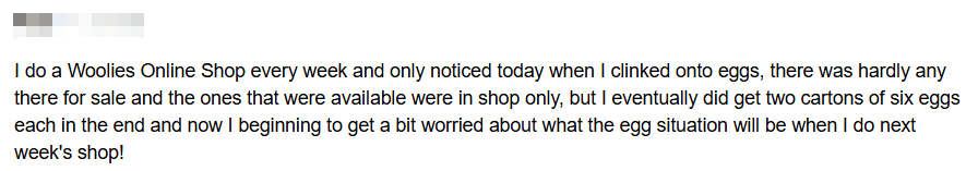 “每周我都会在Woolies进行网上购物,今天才注意到当我点击鸡蛋时,显示没有货,而那些有货的店只能去店里买,不过最后我还是买到了两盒六个装的鸡蛋。现在我开始有点担心下周购物时的鸡蛋情况了!”