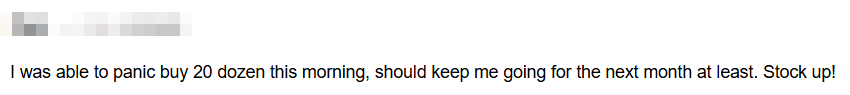 还有一位网友表示,自己已经开始囤鸡蛋了,“我今天早上抢购了20打鸡蛋,至少能让我撑一个月。赶紧囤货吧!”