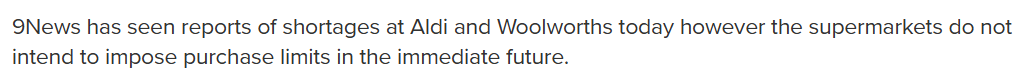 尽管不少商店内货架几乎是空的,但Woolworths表示,不会出现大范围的供应问题,也不会对顾客进行购买限制。