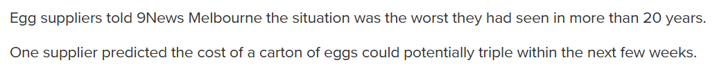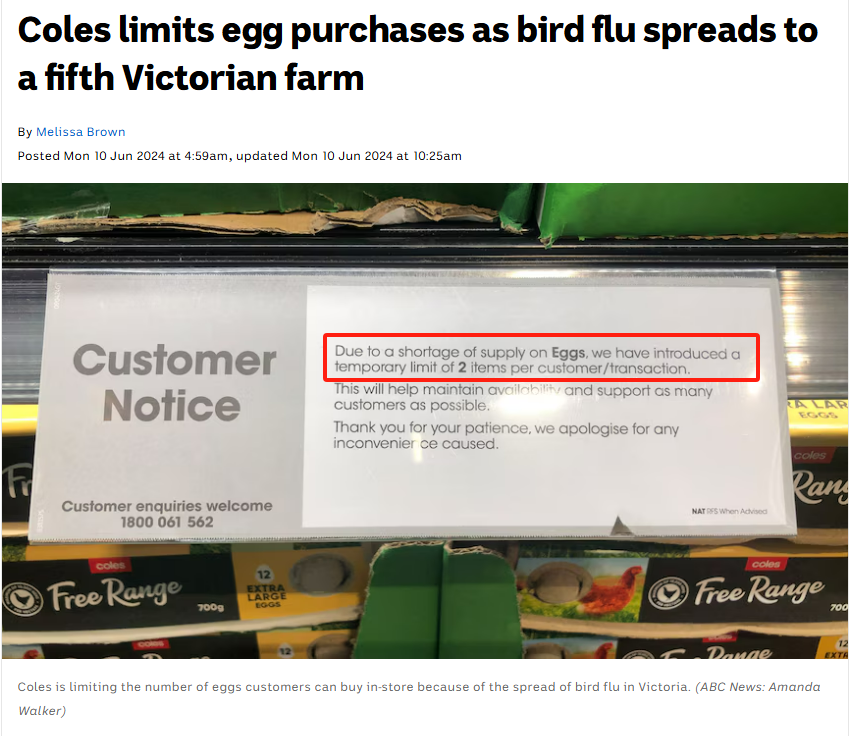 这一情况直接影响到了全澳的鸡蛋供应,尽管行业组织澳大利亚蛋业协会表示公众无需担心,但这并没有阻止消费者囤积鸡蛋: