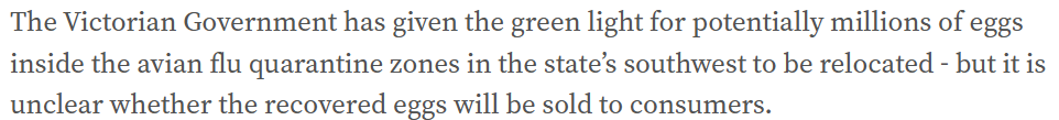 政府已批准将维州西南部禽流感检疫区内大约数百万枚鸡蛋转移,但目前尚不清楚这些鸡蛋是否会出售给消费者...