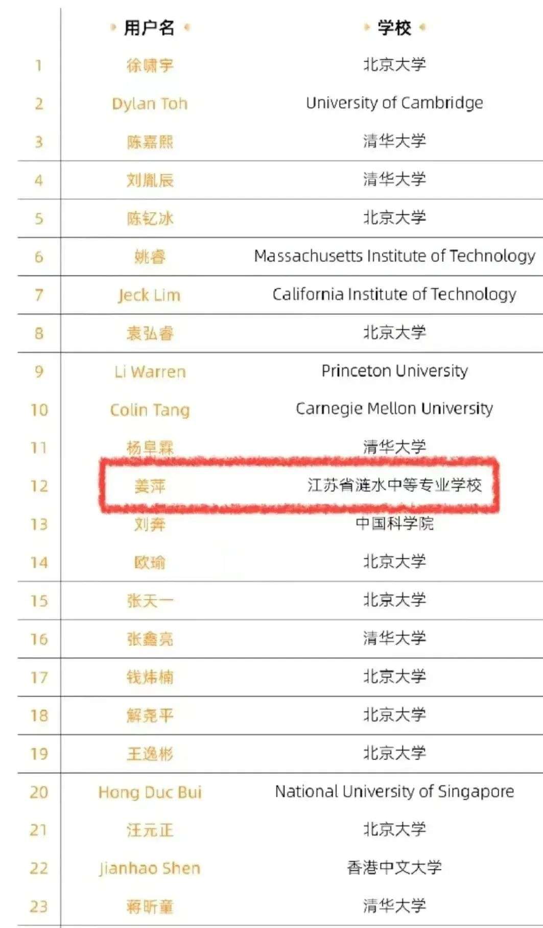 排在她前面的,清一色来自北京大学、剑桥大学、麻省理工学院、普林斯顿大学、清华大学等专业级数学高手。
