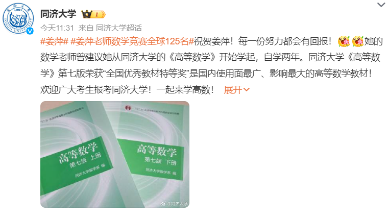 据了解,姜萍一直都对数学有着强烈的兴趣,自己平时学的她觉得没有价值,就开始了解高等数学并自学: