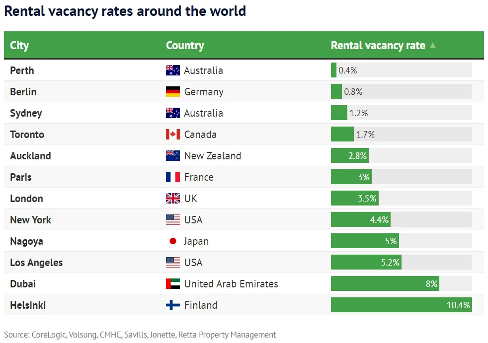 最近,在一份“世界级”的榜单上,珀斯又占领了一席之地。WAtoday利用澳大利亚国内,以及国际资料独家整理的一份数据显示,与全球众多大城市相比,珀斯的租房市场是最紧张的,空置率仅有0.4%。在所分析的城市中,人口与珀斯相近(380万)的柏林的空置率最低,仅为0.8%,其次是悉尼(1.2%)、多伦多(1.7%)和奥克兰(2.8%)。