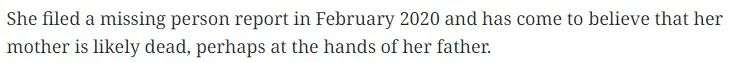 2020年2月,在8个月后,艾莉终于将妈妈去世的消息告知了安吉拉在纽约的家人,同时她向警方提交了一份失踪人口报告,并开始相信她的母亲很可能已经死亡,也许是死于她父亲之手。
