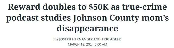 艾莉家人聘请的私家侦探今年3月将悬赏金金额翻了一倍,希望能引起公众的持续关注,呼吁任何知情人士请拨打 TIPS 热线 816-474-TIPS (8477) 或 Prairie Village 警察局 913-642-6868。
