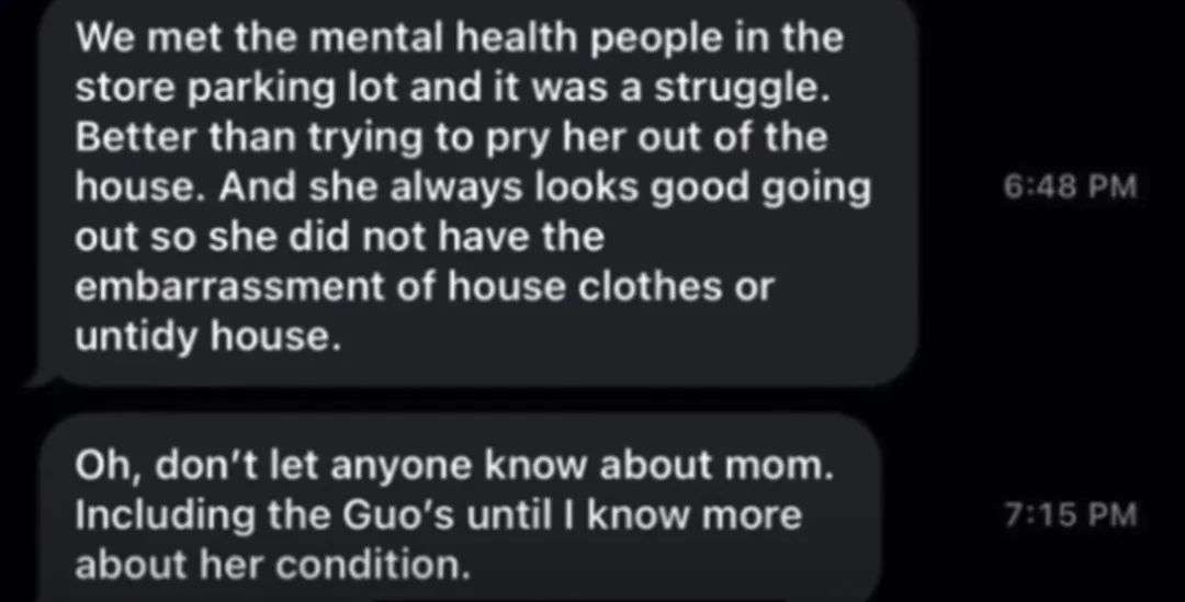 在住到男友家第三天后,艾莉收到了父亲的短信,说他已经把她母亲送进了附近的一家精神病院。他表示他把安吉拉拉到了一个停车场,精神病院的人在那里去他们汇合,并接管了安吉拉。但他没有说具体在哪里,并跟艾莉强调不要告诉安吉拉美国这边的家人。