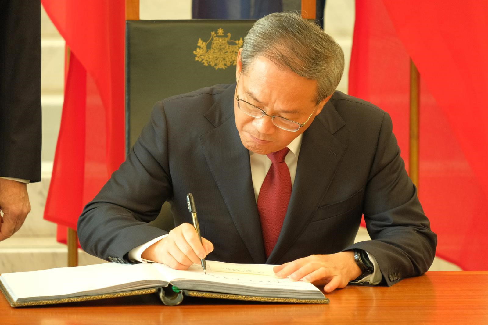 在中澳领导人年度会议闭门会谈之前,李强总理已在来宾签到簿上签字。