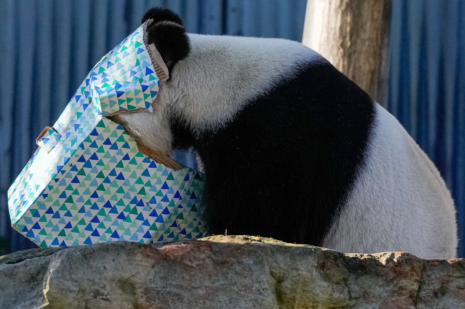 李强来访,大熊猫“网网”把头钻进盒子里。(Asanka Ratnayake/Pool via REUTERS)