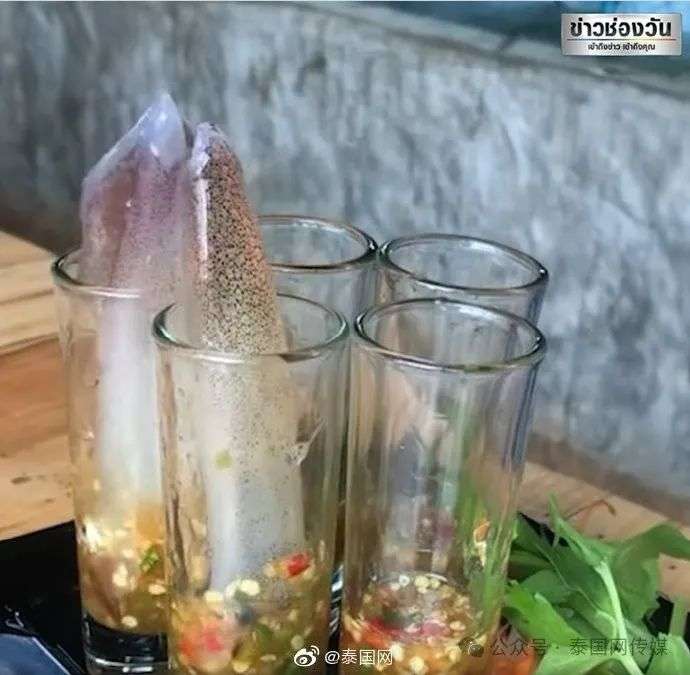 近年来,泰国部分民众流行起生吃鱿鱼,他们用活着的鱿鱼沾海鲜蘸水然后生吃,并直呼美味极了。
