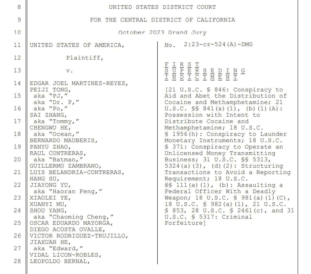 司法部共指控24名被告犯有一项串谋协助和教唆分销可卡因和甲基苯丙胺(俗称冰毒)罪、一项共谋洗钱罪和一项共谋经营无证资金转移业务罪。