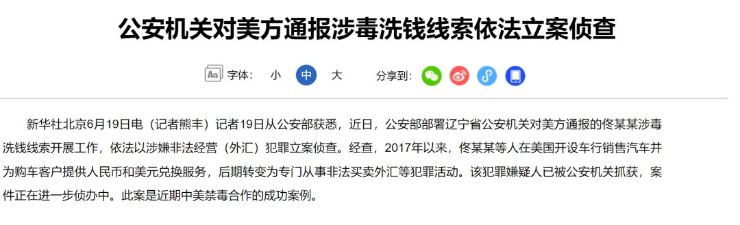 新华社称,中国公安部部署辽宁省警方近日根据美方通报的佟某某涉毒洗钱线索,依法以涉嫌非法经营(外汇)犯罪立案侦办。