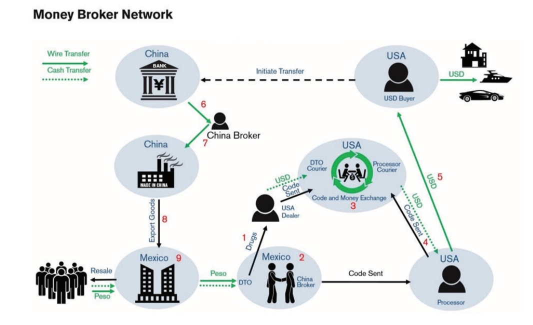 在中国取得的资金,被用来支付墨西哥或其他地方的企业和组织购买的商品,如一些消费品,但同时也会帮助贩毒集团购买制毒所需的药物,如芬太尼的前体化学品等。