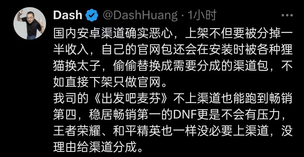 心动公司CEO黄一孟在社交平台上评论称,国内安卓渠道上架不但要被分掉一半收入,自己的官网包还会在安装时被各种"狸猫换太子",被偷偷替换成需要分成的渠道包,不如直接下架,只做官网。"我司的《出发吧麦芬》不上渠道也能跑到畅销(榜)第四,稳居畅销榜第一的《DNF》手游更不会有什么压力。《王者荣耀》和《和平精英》也一样没必要上渠道,没理由给渠道分成。"