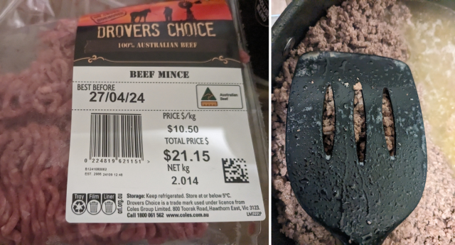 因为来自新南威尔士州塔姆沃思的Jo Meredith也有类似的发现。她在Coles购买了一公斤半的牛肉末,价格为$21.50。