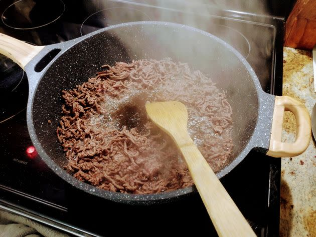 “这是不被允许的,他们也不可能逃过检查,”他解释道,之所以炒肉末的时候会有大量的液体是因为自然存在的水分和脂肪。
