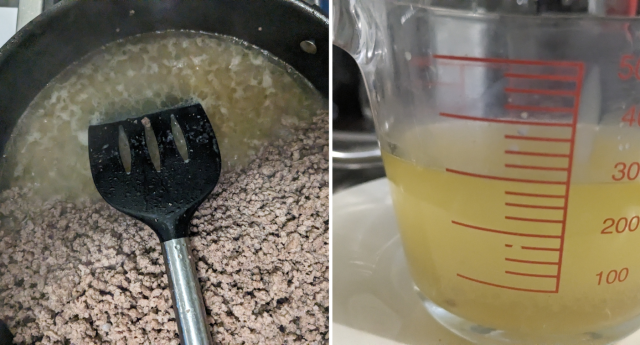 回家之后,他先煮了Woolworths的牛肉末,边煮边渗出了大量的水!然后他用同一个锅煮了肉店的牛肉末,发现水分少得多。