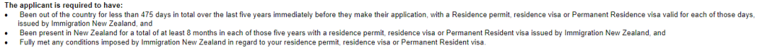 申请人在过去5年中一直拥有新西兰永居权(持有RV或PRV),或申请人为澳洲公民/PR持有者,需要在新西兰居住至少5年。