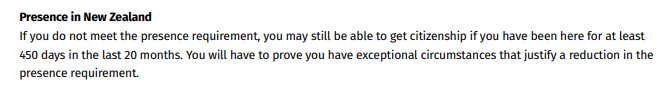 特殊情况:如申请人不符上述居住要求,但只要你在过去20个月内至少在新西兰住够了450天,申请人仍能申请公民身份,不过需证明有特殊情况。