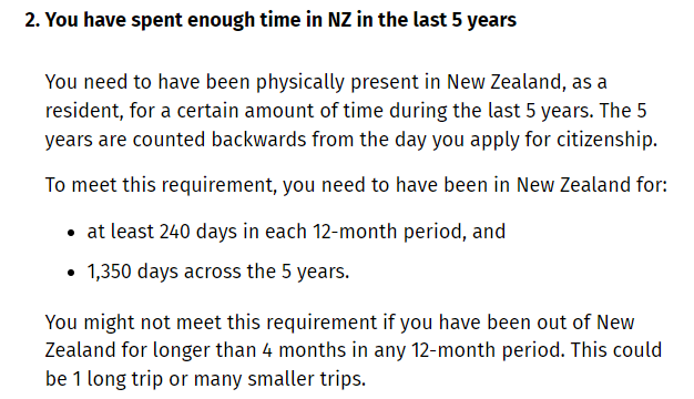 也就是说,从申请人获得RV那一天起,就可以开始算到5年里。而所谓的5年,是从你申请入籍那天往前推算的5年,一共要在新西兰住满1350天。每年还有单独的居住要求,需要申请人每年都要住够240天。
