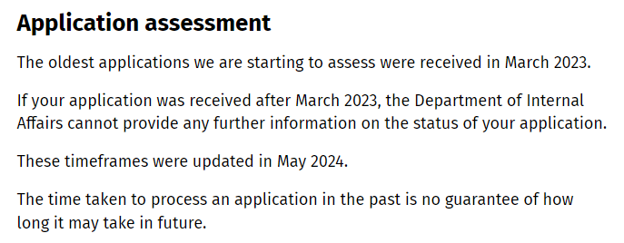 目前正在处理的申请最早可追溯至2023年3月,如果你的申请晚于这一时间递交,内政部无法提供有关申请状态的更多信息。本月(2024年5月)内政部将会更新处理周期。