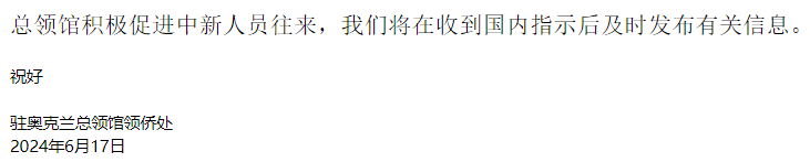 得到的回复是:“总领馆积极促进中新人员往来,我们将在收到国内指示后及时发布有关信息。”