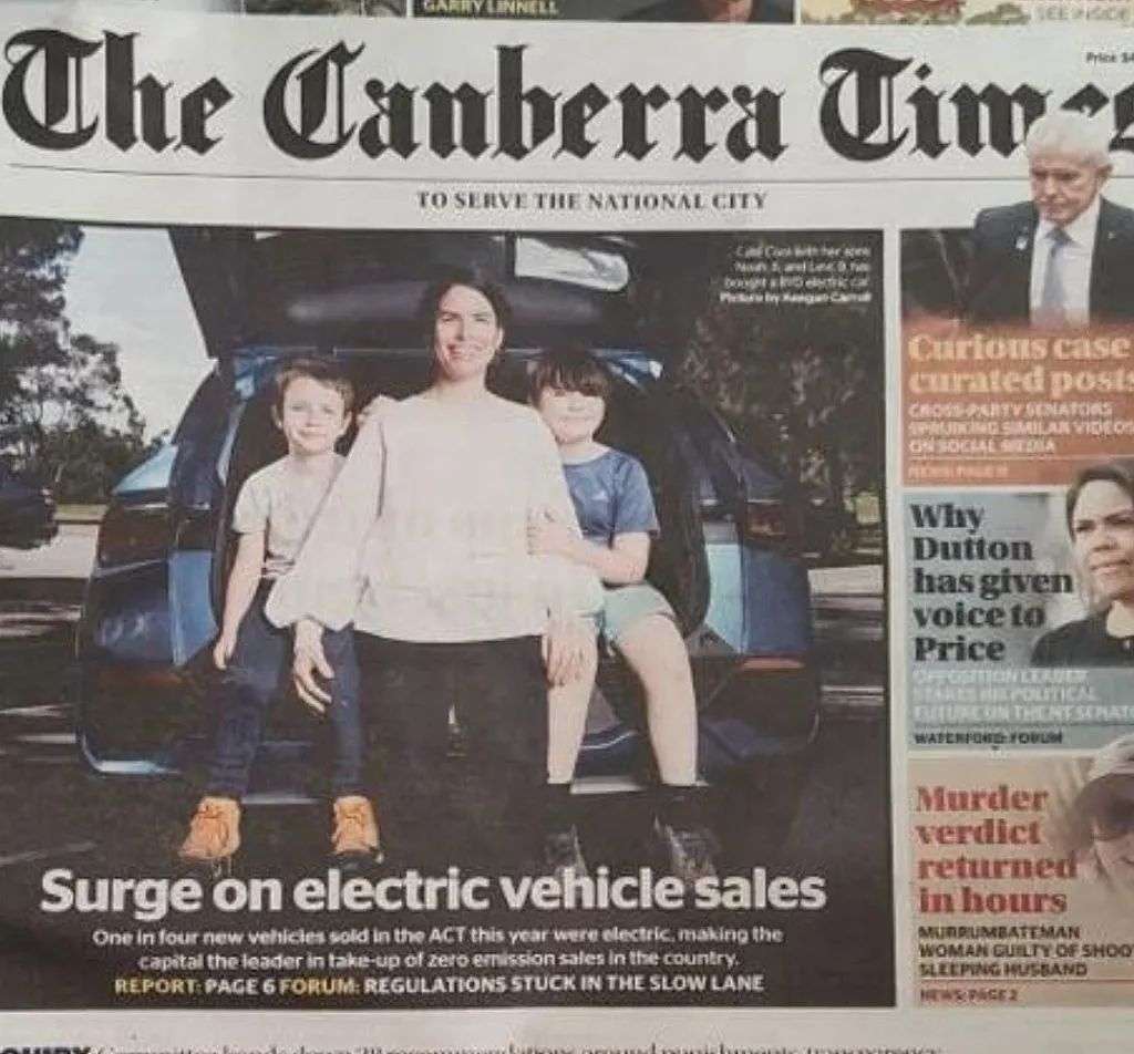 就在去年4月,《堪培拉时报》刊登了一篇关于电动汽车在澳销量激增的报道,Cate和两个儿子的合影也登上了头版,这家人还表达了对BYD的喜爱。