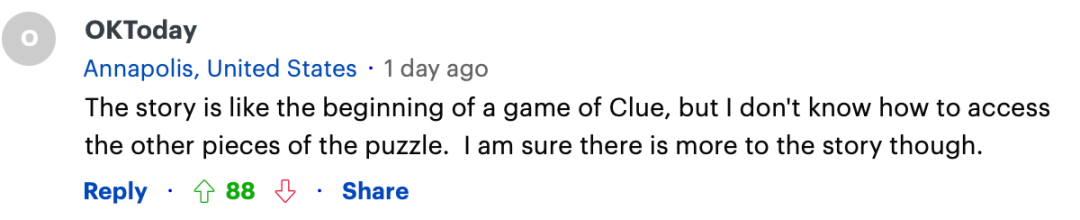 “这故事感觉像是拼图的开始,我不知道拼图的剩下部分何处寻找,但我肯定这事背后还有更多故事。”