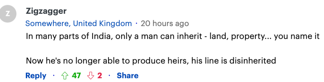 “在印度很多地方,只有男继承人才有继承权,土地,财产,任何资产。