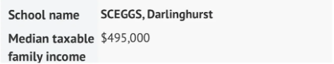家庭收入中位数最高的是悉尼女校SCEGGS Darlinghurst ,其家庭收入49.5万澳币;